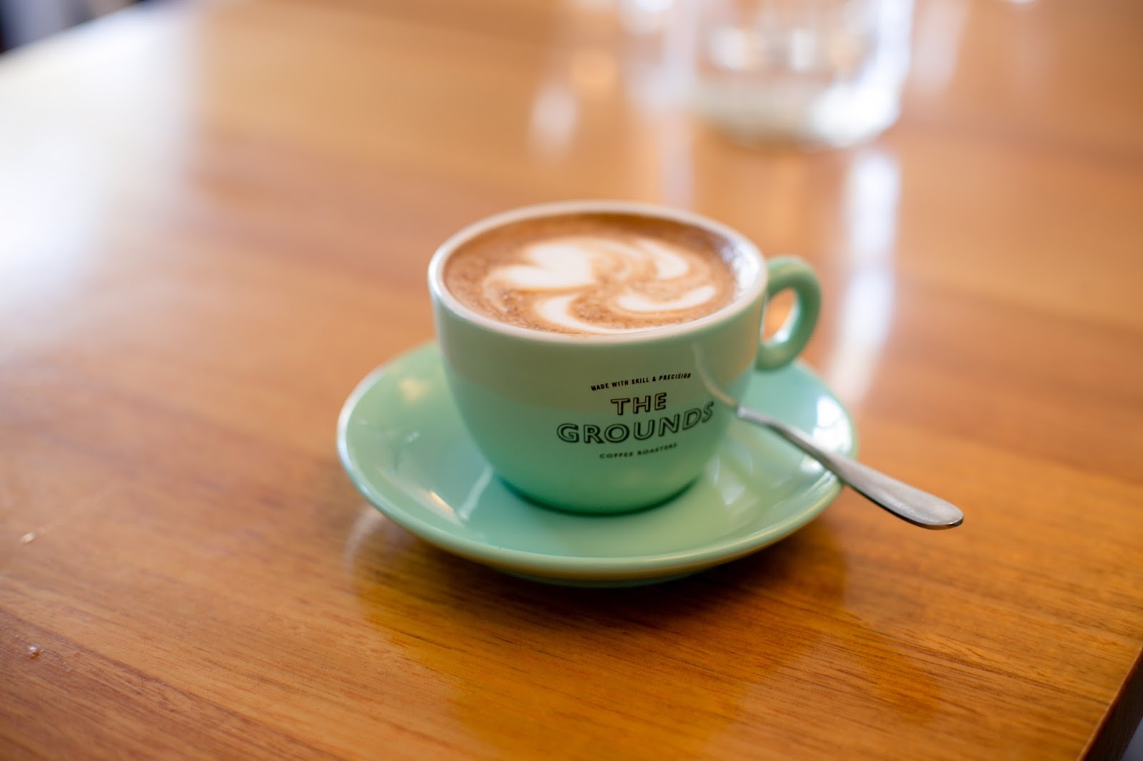 Flat white from The Grounds. Teal tea set with fancy print explains the $4.00 'cuppa'.
